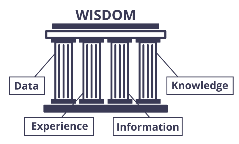 Words (data, information) allow for theoretical understanding. Experience enables practical knowledge. Accumulated wisdom is the discerning use of knowledge over time.